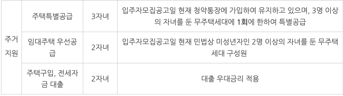 자녀가 2명일 경우에는 임대주택 우선공급, 주택구입, 전세자금 대출 우대금리를 적용받을 수 있습니다.